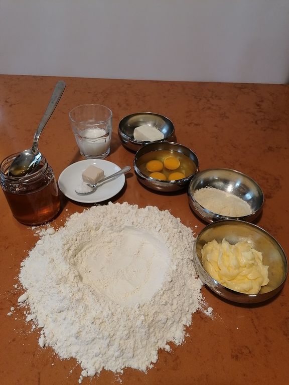 Setacciate la farina sulla spianatoia, formate un incavo al centro, sbriciolate il lievito all’interno e fatelo sciogliere aggiungendo il latte tiepido. Iniziate a impastare unendo le uova sbattute, il miele, lo stracchino e il Grana. Quando l’impasto prenderà forma e comincierà a cordare sviluppando il glutine, unite il sale e il burro molto morbido a fiocchetti, fino ad ottenere un impasto liscio e omogeneo, molto più morbido dell’impasto della pizza. Se preferite effettuate l’impasto con l’impastatrice. Mettete l’impasto in una capace ciotola unta di olio, coprite con pellicola o con un panno e fate lievitare per almeno 2 ore a 26-28 °C (dovrà più che raddoppiare).