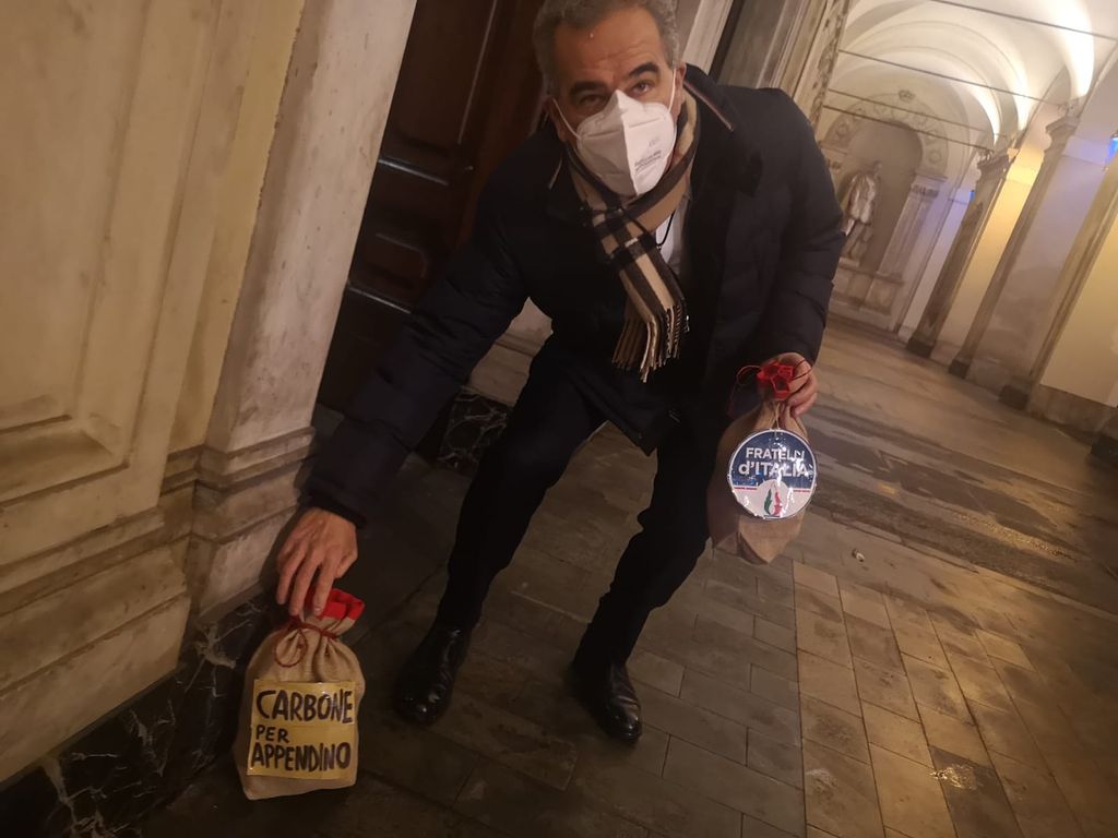 Due sacchi di carbone per la sindaca di Torino Chiara Appendino. A recapitarli direttamente in Comune è stato l'esponente di Fratelli d’Italia Enzo Liardo, in occasione della festa dell'Epifania.