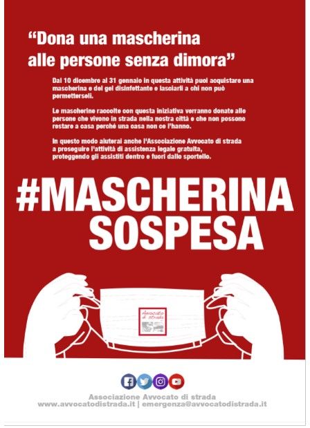 Una mascherina “sospesa” da donare alle persone senza dimora. E' l'ultima iniziativa di Avvocato di Strada Onlus, l'associazione che fornisce assistenza legale gratuita ai senza tetto e che dal 10 dicembre scorso è all'opera per raccogliere mascherine e gel igienizzanti da destinare agli homeless.