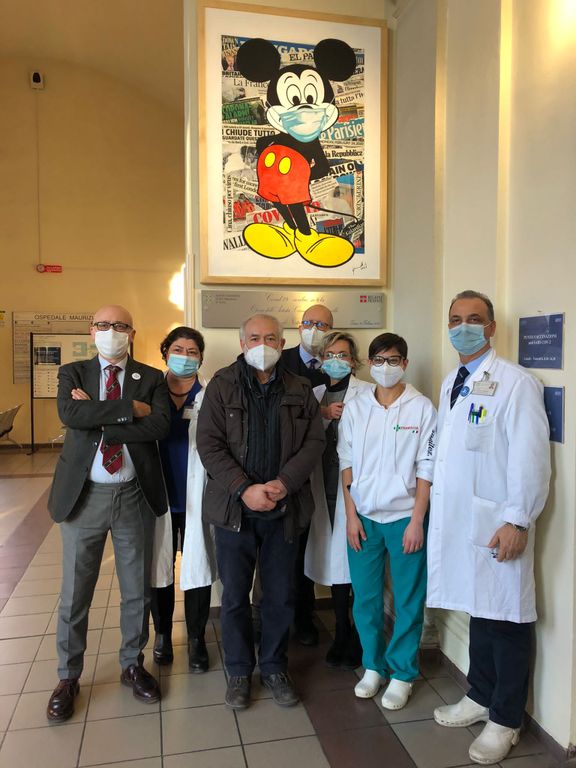 L'artista Carmelo Giammello, autore per “Luci d'artista” del famoso Planetario, ha donato all'ospedale Mauriziano una sua opera d'arte su tela: un Topolino con la mascherina.