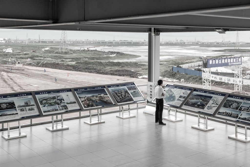 Il percorso della mostra si snoda lungo due sequenze logiche: la prima prende il via dalla ricostruzione di una exhibition hall, luogo iconico tipico delle new town cinesi, in cui le amministrazioni pubbliche e le imprese di costruzioni mettono in scena la città per promuoverne lo stile di vita e i successi raggiunti, e arriva all’urbanizzazione globale. La seconda sequenza si muove partendo da spazi vuoti e atoni per arrivare alle persone, ai singoli individui ripresi nelle loro attività quotidiane o in ritratti “situati” dentro i nuovi insediamenti. Le due sequenze si intrecciano continuamente, smontando via via il rassicurante concetto di “eccezionalità” cinese: ciò che da lontano e a uno sguardo superficiale appare esotico e distante, si rivela molto più familiare di quanto crediamo. Le nuove urbanizzazioni cinesi non appaiono più come “altro da noi”: nelle new town della Cina contemporanea la vita quotidiana è fatta degli stessi piccoli gesti di cui è fatta la vita a ogni latitudine e le persone che li compiono non sono diverse da noi nei comportamenti, nelle pratiche, nei desideri.