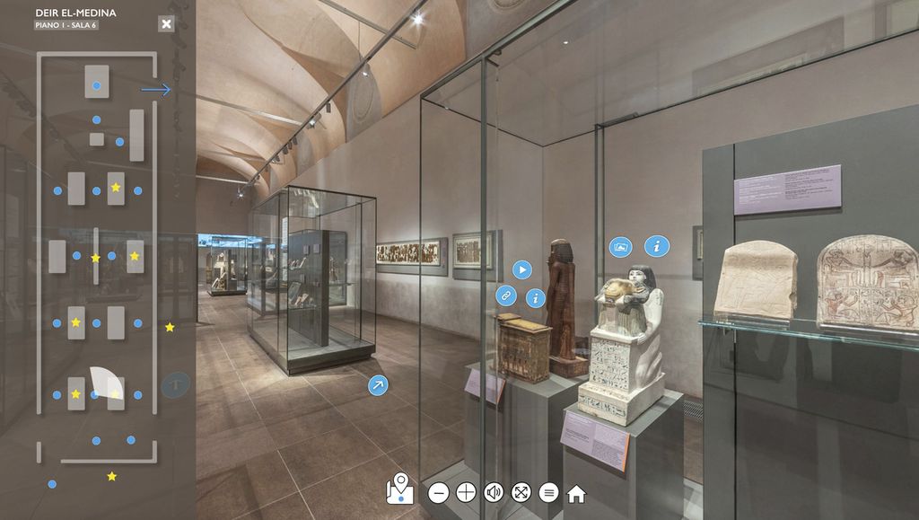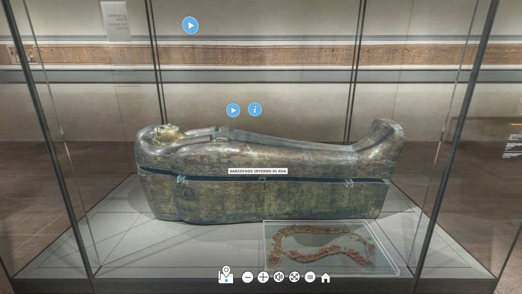 All’indirizzo https://virtualtour.museoegizio.it/, partire da una serie di foto panoramiche a 360 gradi in alta definizione, il percorso ricostruisce gli ambienti dedicati ai reperti provenienti dalla tomba intatta dell’architetto Kha e di sua moglie Merit, e dal villaggio degli artigiani e degli operai di Deir el-Medina.