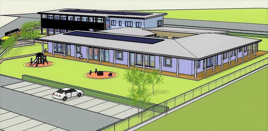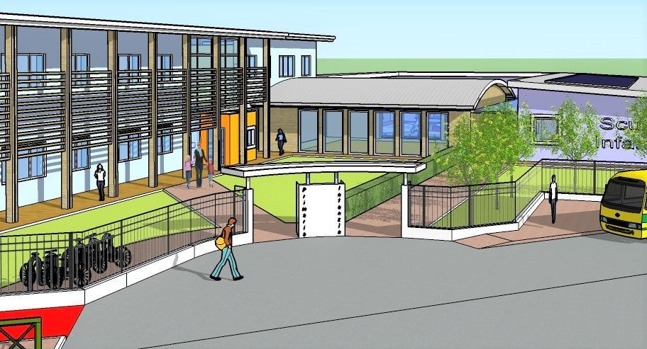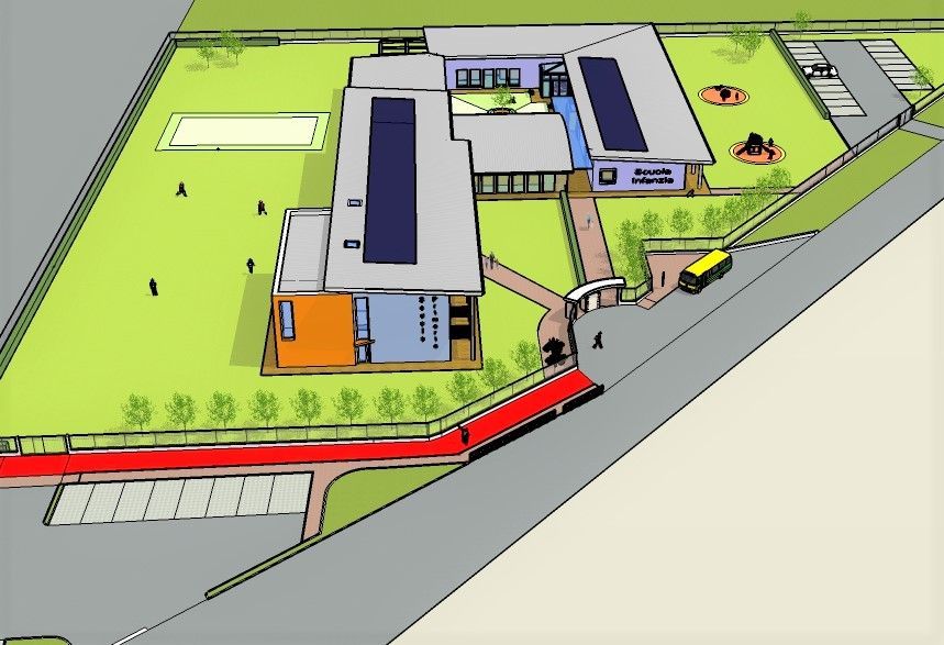 Il complesso scolastico delineato nel progetto si articola su due piani fuori terra per la scuola primaria, mentre la scuola d’infanzia si svilupperà esclusivamente al piano terra. Non sono previsti piani seminterrati o interrati abitabili.