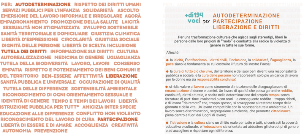 La rete vuole poi “stimolare iniziative per la promozione del lavoro con investimenti, pubblici e privati, per creare occupazione di qualità, investendo nei servizi pubblici per l’infanzia e per le famiglie che spesso sono una delle cause di difficoltà nell’accesso ma soprattutto alla permanenza delle lavoratrici nel mercato del lavoro. Vogliamo il riconoscimento del lavoro di cura e riproduttivo e del lavoro discontinuo/precario con l’emersione del lavoro informale/irregolare (80% media UE) nell’ambito della cura che è in capo alle donne per 75% e in particolare alle donne migranti”.