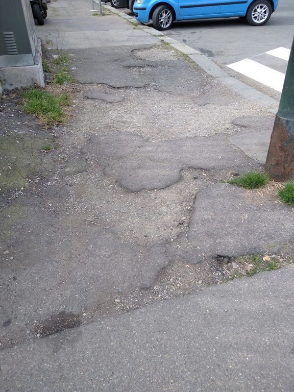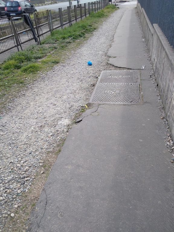 Asfalto sconnesso o mancante, cordoli rotti e transenne. E’ una vera e propria gimcana tra ostacoli quella che un passante deve effettuare per transitare in via Borgaro, nel tratto tra largo Borgaro e via Val della Torre.