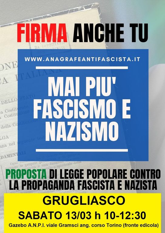 A Grugliasco l'ANPI prosegue la raccolta firme contro la propaganda nazista e fascista in sostegno alla legge d'iniziativa popolare partita da Sant'Anna di Stazzema, luogo simbolo della Resistenza, in cui i nazifascisti hanno commesso il 12 luglio 1944 una delle stragi più sanguinose di tutto il periodo di occupazione 1943-1945, 560 persone tra cui 130 bambini fatti a pezzi e bruciati.