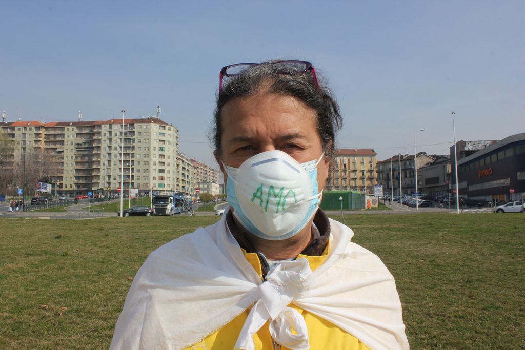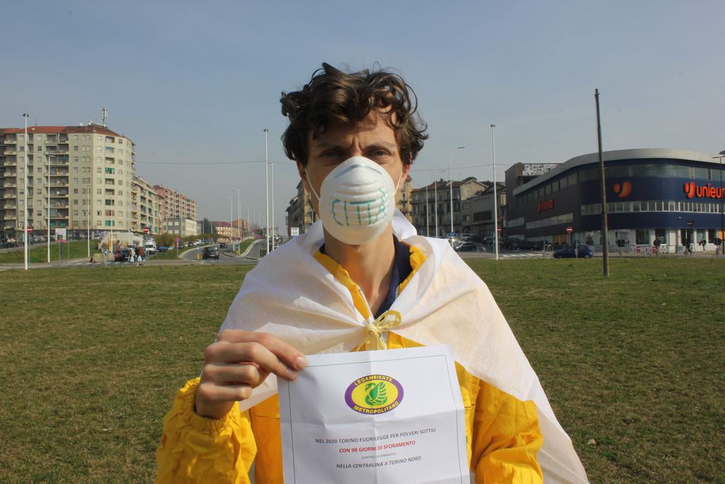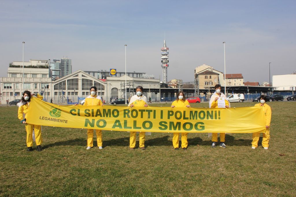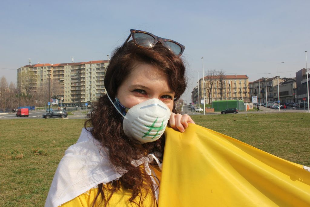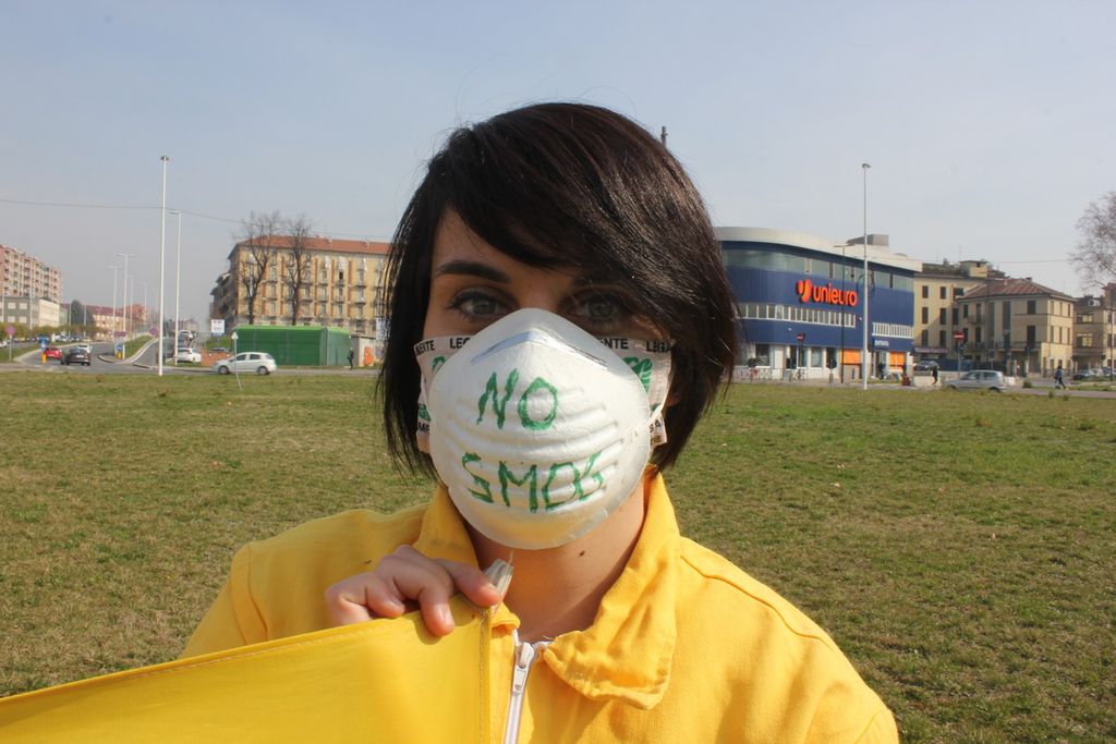 Piazza Baldissera si colora di giallo per il flash mob organizzato da Legambiente a Torino. I giovani attivisti, rigorosamente in tuta, hanno scelto uno dei luoghi nevralgici, simbolo del traffico veicolare della città, per urlare il loro slogan: "Ci siamo rotti i polmoni".