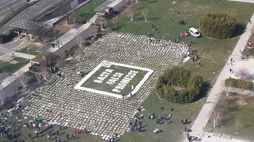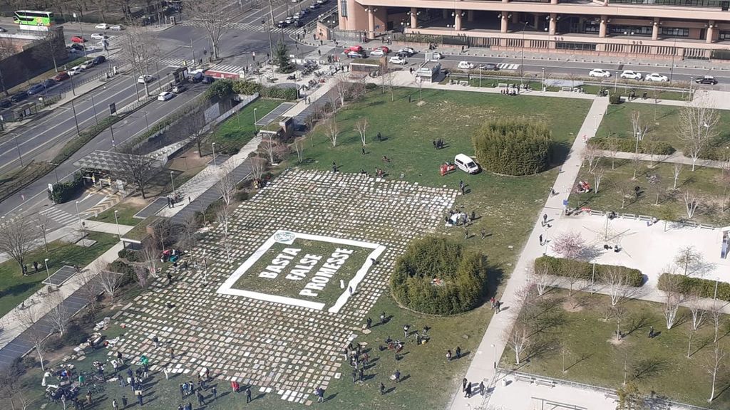 Una scritta a caratteri cubitali e più di duemila cartelli contro la crisi climatica hanno decorato i giardini Grosa di Cit Turin, tra il grattacielo Intesa Sanpaolo e il Tribunale