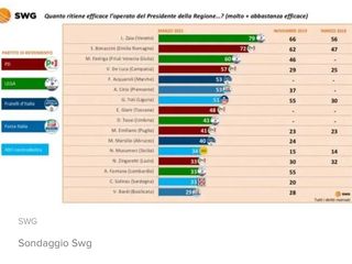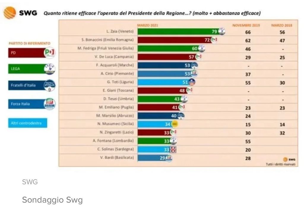 Primo in classifica il governatore del Veneto leghista Luca Zaia (79%), seguito da quello dell’Emilia Romagna dem Stefano Bonaccini (72%), entrambi rieletti lo scorso autunno con una percentuale molto alta di voti.