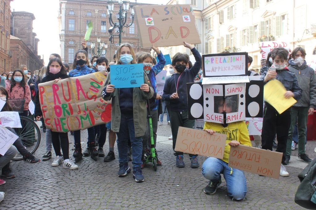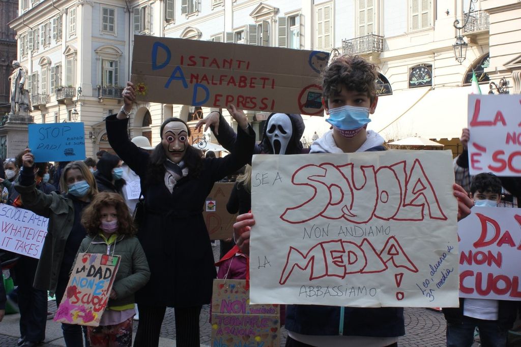 Cartelloni in mano, maschere, campanacci, pentole e coperchi. E’ un esercito colorato di bimbi, maestre e genitori quello che ha letteralmente invaso piazza Carignano per aderire allo sciopero della Dad.