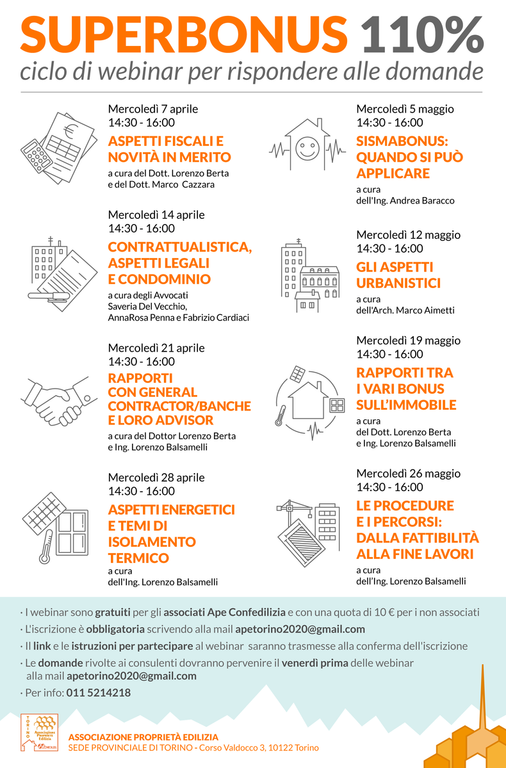 A partire dal 7 aprile 2021, ogni mercoledì dalle 14,30 alle 16 sulla piattaforma Zoom, i consulenti di Ape Confedilizia Torino spiegheranno, in modo pratico, come funziona l’Ecobonus 110% e quali sono le sue caratteristiche principali.