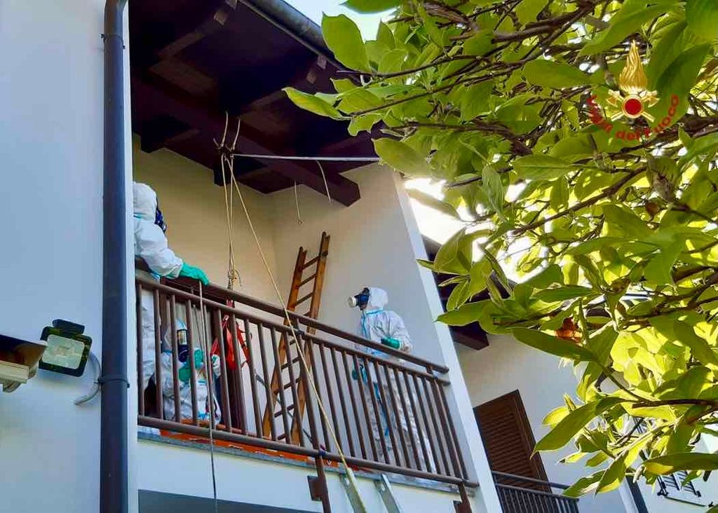 Ivrea, i vigili del fuoco soccorrono una paziente a casa portandola fuori con un sistema di funi con barella