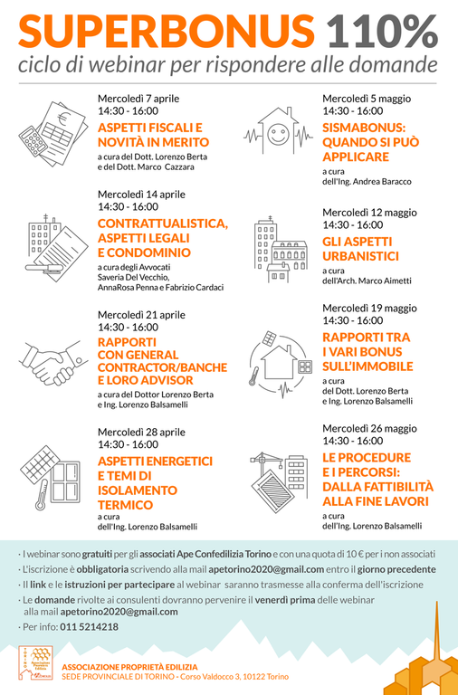 I webinar sono gratuiti per gli associati Ape Confedilizia e con una quota di 10 euro per i non associati.