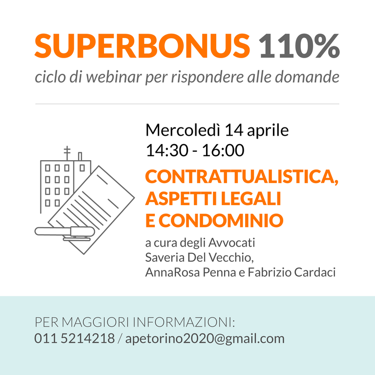 Il nuovo appuntamento è previsto il 14 aprile 2021, dalle 14,30 alle 16 sulla piattaforma Zoom, i consulenti di Ape Confedilizia Torino spiegheranno, in modo pratico, gli aspetti legali, contrattuali e condominiali legati all’Ecobonus 110%.