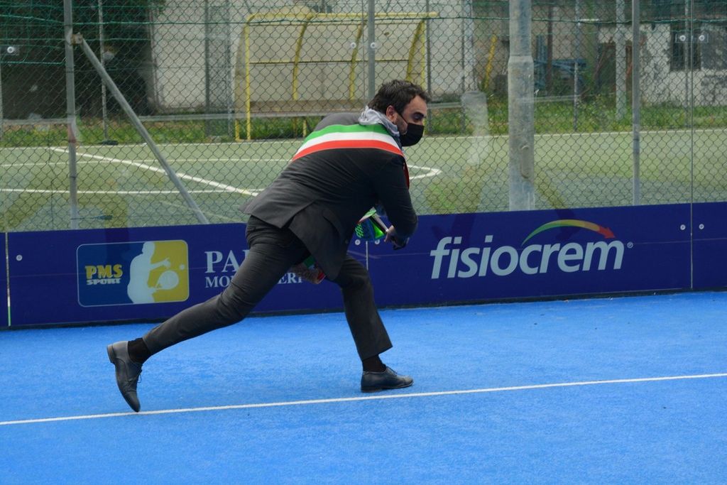 Dopo il simbolo “taglio del nastro”, un simpatico siparietto per il Sindaco e l’Assessore, che hanno scambiato due colpi sul campo appena inaugurato, sfidando Ferrara e Carlotta Colombo, giocatrice professionista e insegnante di Padel dell’Impianto Einaudi.