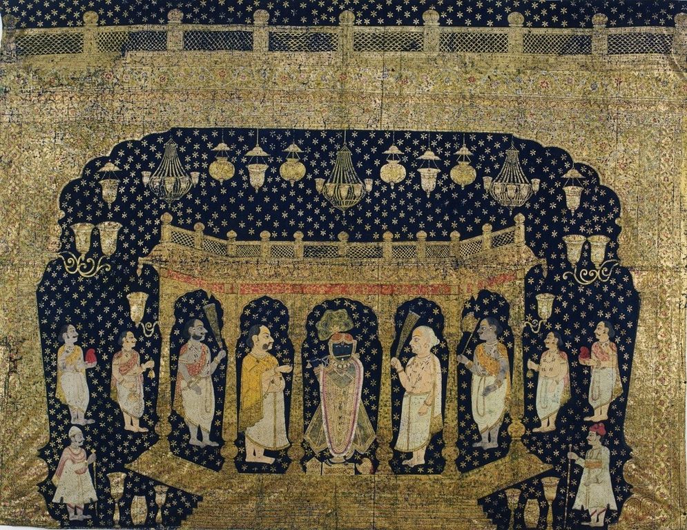 Krishna è una delle divinità indiane più conosciute in Occidente, manifestazione terrena del dio Vishnu e fulcro della corrente devozionale della bhakti. Tradizionalmente i picchavai vengono esposti nella sala interna del tempio dove è venerata l’immagine di Krishna, per adornare le pareti e gli arredi.