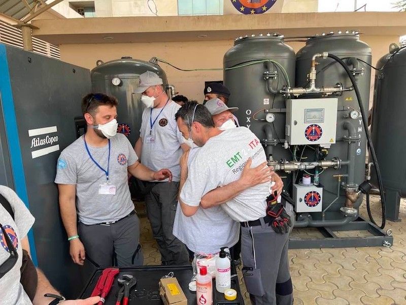 Arrivati in India, l’equipe si è subito messa al lavoro per il montaggio dell’apparato che è in grado di autoprodurre ossigeno 61.800 litri di ossigeno all’ora, con la capacità di rifornire in continua 68 pazienti intubati, oppure 17 pazienti in caschi Cpap ad alto flusso, oppure 103 pazienti che necessitino di ossigenoterapia. Si tratta dell’apparato che era stato montato e allestito in occasione della creazione dell’ospedale da campo alle Officine grandi riparazioni di Torino, nel corso della prima ondata di contagi da Covid-19, oltre un anno fa.
