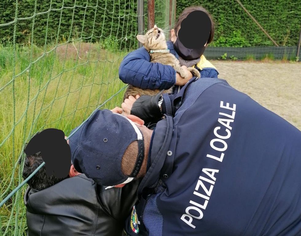 Gatto resta intrappolato tra i fili di una rete e rischia di soffocare, salvato dai vigili urbani di Nichelino