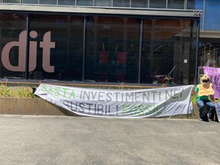Gli attivisti hanno manifestato di fronte alla sede di Unicredit in via Nizza /foto Alessandra Girardello