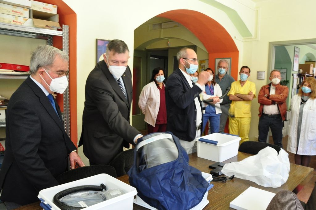 Il valore aggiunto di questi caschi è dato dal fatto che il confort per gli operatori è decisamente superiore, e che con questi presidi il medico o l’infermiere non ha la necessità di usare la mascherina, e il paziente, spesso terrorizzato anche dalle figure “mascherate” che lo circondano può vedere in faccia un altro essere umano e, quando necessario anche leggere il labiale. “Lo sguardo dei beneficiari delle nostre donazioni – ha detto il Governatore del Rotary Michelangelo Di Biasio - mi fa essere ogni giorno più fiero di essere rotariano. Anche se in questi 2 anni abbiamo rinunciato a molte cose, siamo riusciti a fare ancora di più grazie a persone che dedicano il loro tempo, energia ed entusiasmo agli altri”.