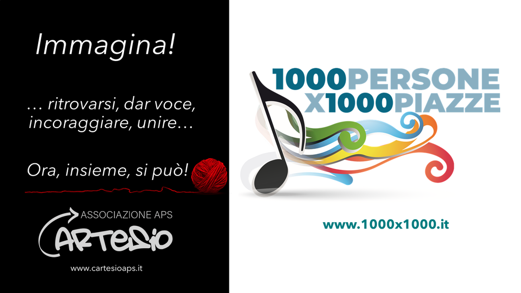 In allegato si trasmettono le prime immagini della campagna di sensibilizzazione social di iniziata da Cartesio Aps per il lancio del progetto “1000 Persone x 1000 Piazze”.