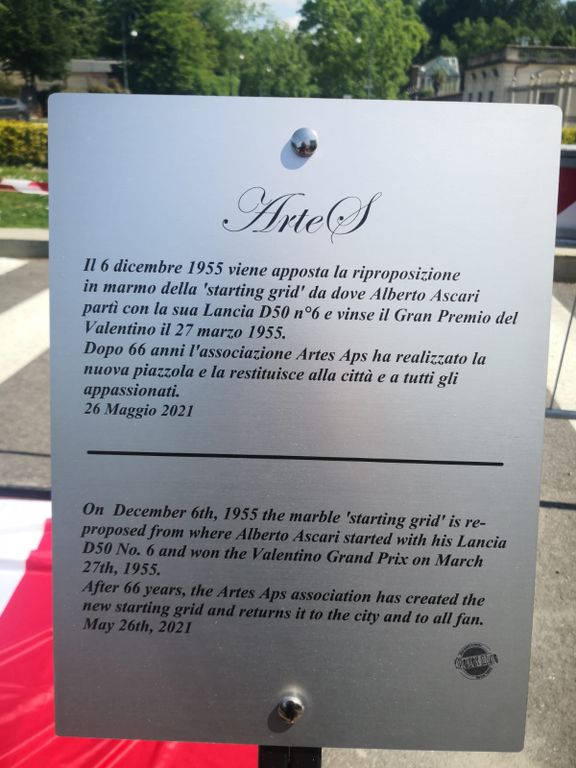 Ascari, ultimo italiano campione del mondo di Formula 1, vinse con le Ferrari i titoli del 1952 e del 1953. Morì due mesi dopo il Gran Premio del Valentino, il 26 maggio 1955, provando una Ferrari 750 all’Autodromo di Monza. Per celebrarlo Artes ha restaurato la piazzola di partenza, a 66 anni esatti dalla sua scomparsa.