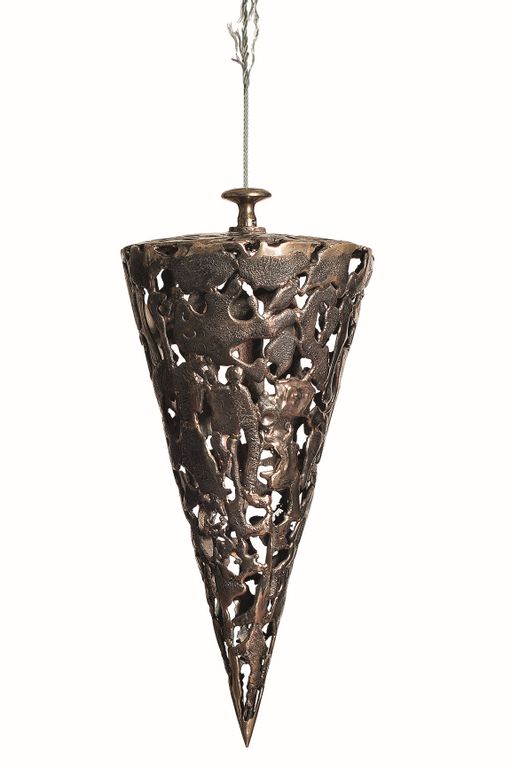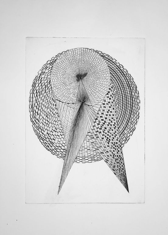 La mostra combina un “tracciamento spaziale” imperniato sulle forme del cono e della sfera a due corpus di opere: una serie di sculture che hanno nella figura del filo a piombo la matrice germinativa propagata in installazioni nello spazio e in dipinti a parete, realizzate per questa occasione, e una sequenza di altorilievi materici semisferici, i cosiddetti Scudi. In essi l’artista persegue una ricerca scultorea intesa come un ritmico scambio tra il “mettere” e il “levare” su cui la luce continua a svolgere un fondamentale ruolo di articolazione e definizione formale. Una significativa corrispondenza si trova anche nel lavoro incisorio dell’artista, che alla grafica si dedica costantemente sin dall’epoca degli studi in Accademia. In mostra vi è la ricostruzione di un angolo di laboratorio di calcografia da cui proliferano sui muri una varietà di carte. I fogli, acquistati o autoprodotti, sono impressi manualmente da un torchio che ha permesso la restituzione di una tipologia di segni - infittiti ma alquanto sottili - travasata dai solchi incisi ai supporti cartacei, mediante matrici inchiostrate con grassi colori calcografici.