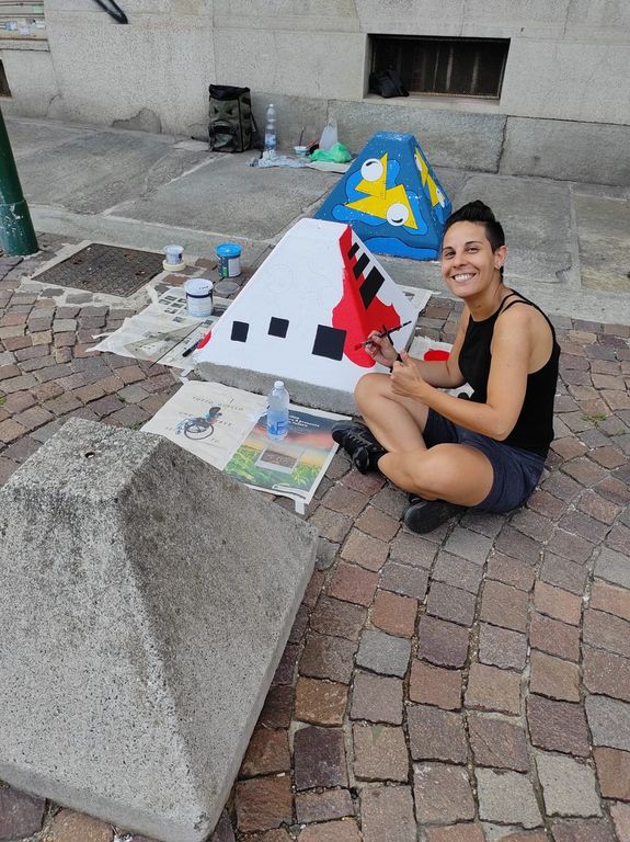 In questa piazza molto vissuta dal quartiere “la pittura diventa un collante per intessere relazioni, per capire le problematiche del quartiere e comprendere le necessità dei residenti”. "Sento spesso -aggiunge -che le auto non vedono i dissuasori di sosta di notte perché grigi e questo causa incidenti stradali. Capita ovunque siano presenti blocchi di cemento. La mia arte diventa quindi anche funzionale per risolvere un ostacolo. Sono residente anche io nella zona. Non potrò risolvere tutti i problemi che ci sono, ma posso contribuire per migliorare quel che c'è”.