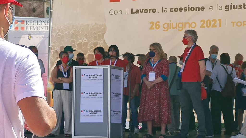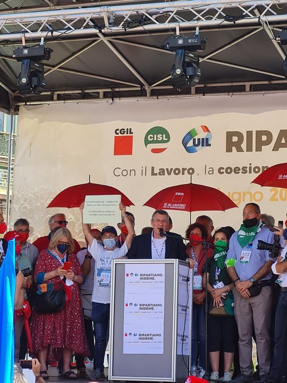 "Ripartiamo, insieme. Con il lavoro, la coesione e la giustizia sociale per l'Italia di domani" è lo slogan delle manifestazioni unitarie di Cgil, Cisl, Uil che si svolgono in contemporanea. A Firenze e Bari sono previsti gli interventi del segretario generale della Cisl, Luigi Sbarra, e del segretario generale della Uil, Pierpaolo Bombardieri. A Torino spazio invece a Landini della Cgil, che parlerà sul palco a mezzogiorno.