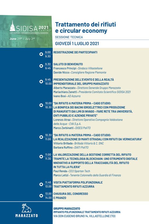 E’ in corso a Torino, dal 29 Giugno al 2 Luglio 2021, l’XI ‘Simposio Internazionale di Ingegneria Ambientale SIDISA’ promosso dall'Associazione Nazionale di Ingegneria Sanitaria Ambientale (ANDIS) e dal Gruppo Italiano di Ingegneria Sanitaria Ambientale (GITISA) in collaborazione con il Politecnico di Torino e partners Gold quali ‘Gruppo Smat’ e ‘Gruppo Marazzato’ per progetti di Ricerca & Sviluppo anche in tema di gestione dei rifiuti speciali.