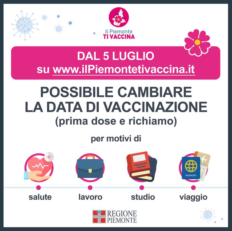 La Regione ha infatti fatto sapere che dal 5 luglio, accedendo con le proprie credenziali al portale www.ilpiemontetivaccina.it, si potrà modificare l'appuntamento in base alle proprie esigenze. Purché si tratti di motivi di salute, lavoro, studio o viaggio.