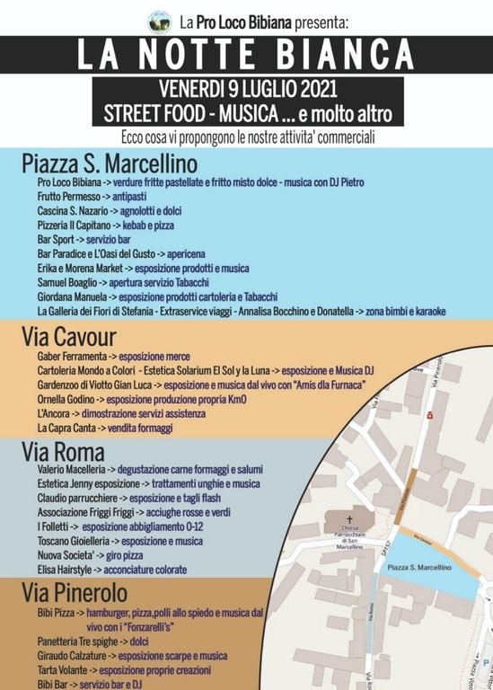 Toccherà ai commercianti, ai bar, agli agriturismi e ai ristoranti, aprire il Luglio Bibianese. Stasera, venerdì 9 luglio, a partire dalle 19 e fino alle 24, le attività del paese proporranno specialità enogastronomiche e musica nelle vie del centro. In occasione della Notte bianca di Bibiana, via Roma, via Pinerolo e via Cavour saranno chiuse al traffico automobilistico. Promotrice dell’iniziativa la nuova associazione commercianti in collaborazione con la Pro loco. Sarà quindi possibile cenare con lo street food proposto dalle attività bibianesi nelle tavolate allestite lungo le vie centrali del paese e la maggior parte dei negozi rimarrà aperta.