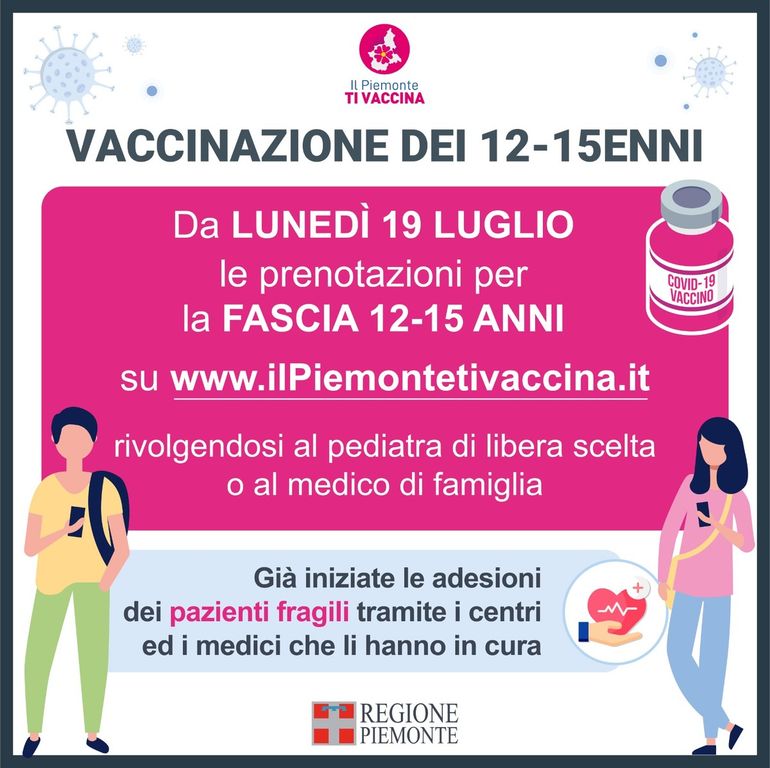 Da oggi, lunedì 19 luglio, partono le adesioni per la vaccinazione dei 12-15enni non fragili.