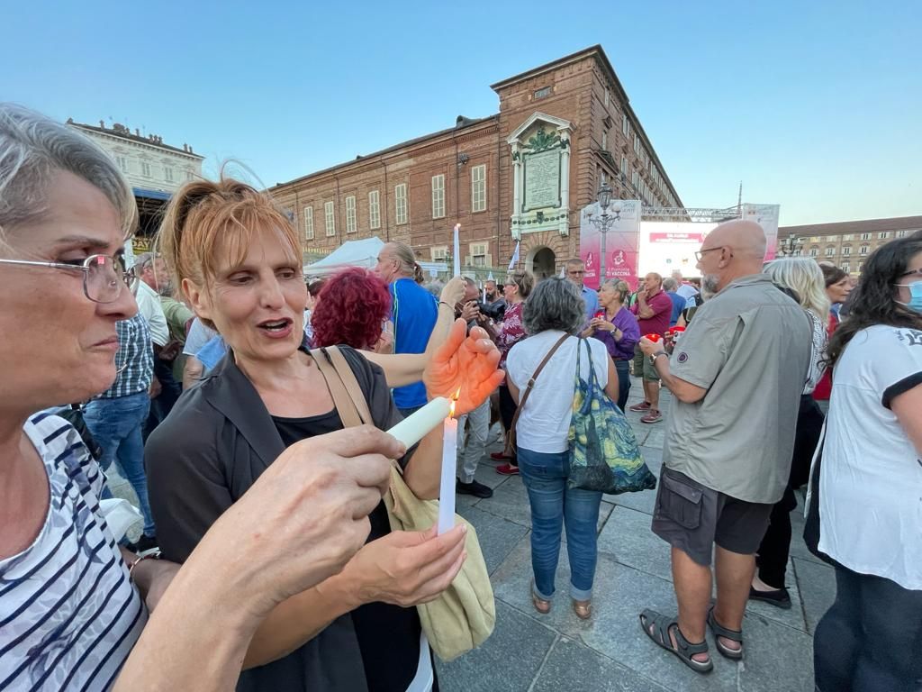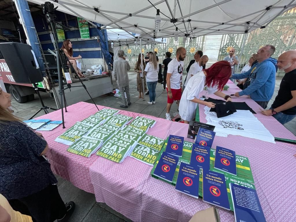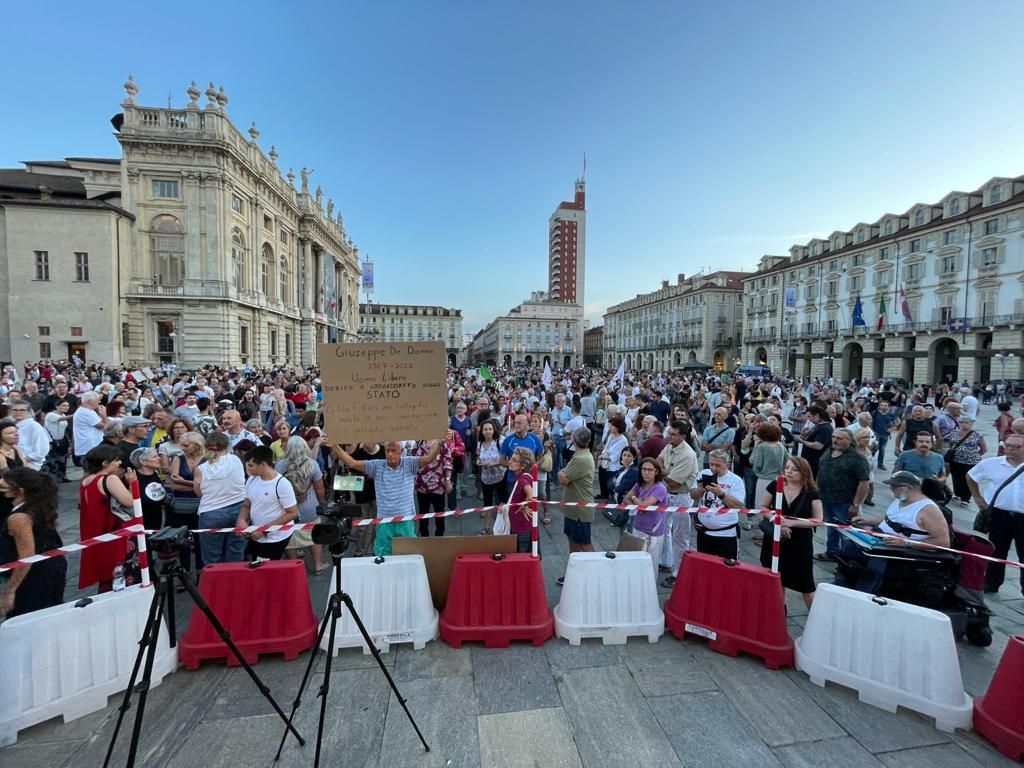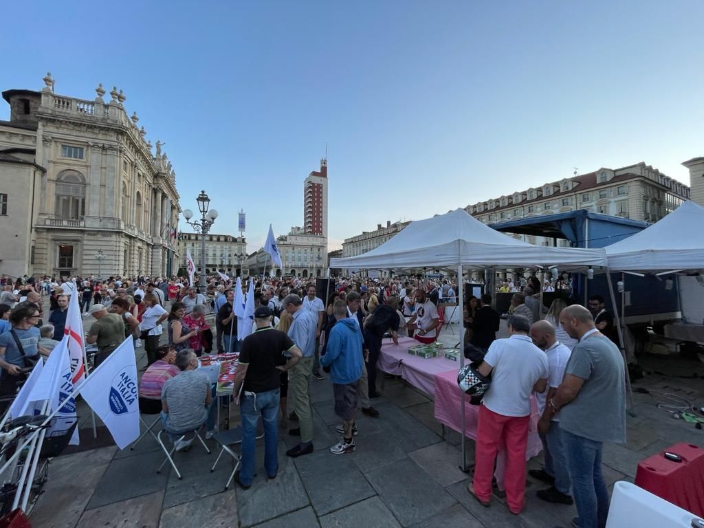 Migliaia di persone hanno affollato stasera piazza Castello per partecipare al “No Paura Day”, manifestazione contro il green pass (da domani in vigore) e l’obbligo vaccinale anti-Covid.