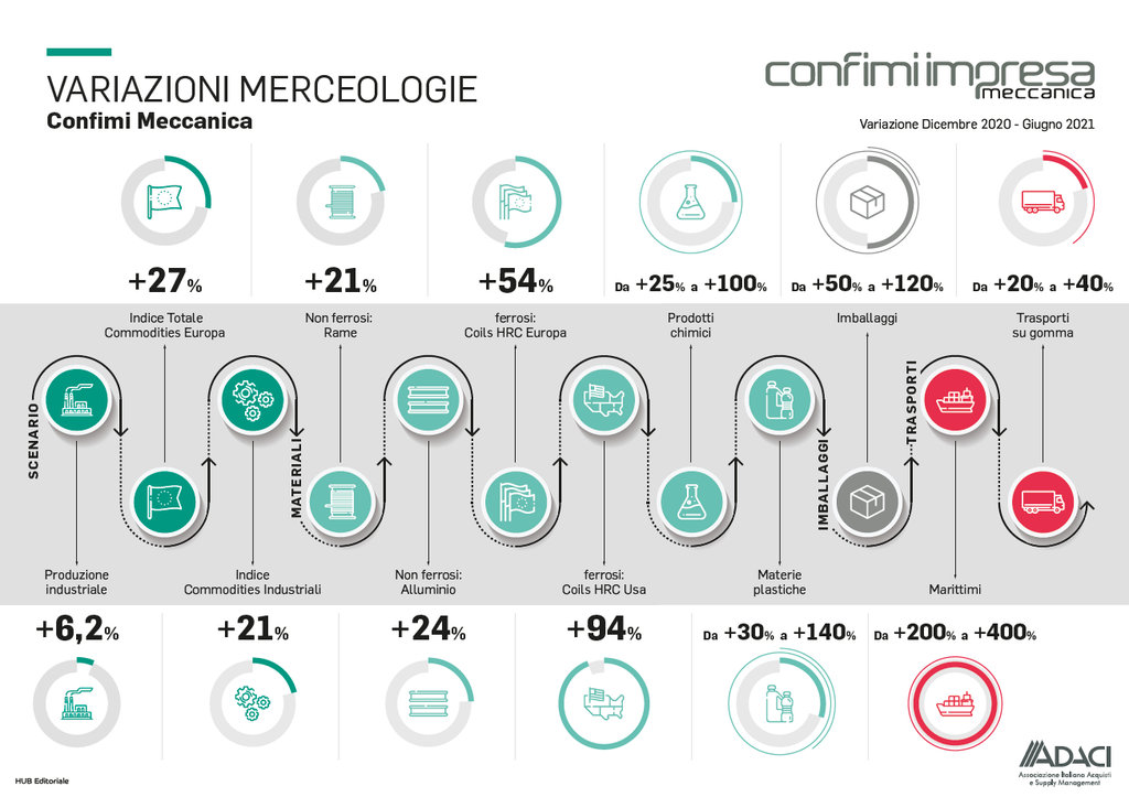Fabrizio Santini, Presidente Nazionale ADACI “Nel promuovere lo scambio di esperienze tra i soci la nostra Associazione raccoglie dati e trend da manager che operano in Aziende nazionali , Gruppi industriali internazionali di ogni dimensione e avvalendosi di collaborazioni con Studi di Ricerca e Analisi Economica ne sintetizza i valori al fine di produrre una informazione che sia fruibile per i soci ADACI mediante l’aggiornamento di strumenti a loro riservati, e resi pubblici in occasione di Workshop, coordinati dal Consigliere Nazionale Nevio Benetello, ed eventi organizzati, oltre a collaborazioni con Associazioni di Imprese come CONFIMI. Questo documento realizzato dal Gruppo di Lavoro coordinato da Donato Gianantoni e Luca Surace, in collaborazione con PricePedia, oltre a fotografare la situazione riguardante diversi settori merceologici vuole essere di stimolo a riflessioni in ambito strategico e sollecitare le Imprese e le Istituzioni ad osservare quanto sta succedendo da fine 2020 a tutto il primo semestre 2021 non solamente come fenomeno ciclico e/o conseguenza della pandemia, ma a valutarlo come forte segnale d’allarme per la vulnerabilità della nostra struttura economica-produttiva ed in particolare per le PMI che caratterizzano e sorreggono il tessuto industriale nazionale”.