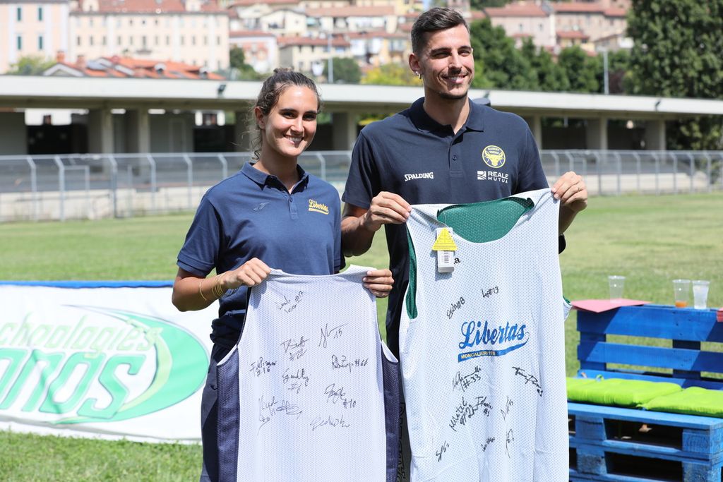 La squadra di Moncalieri ha ricevuto anche la visita di una delegazione di Reale Mutua Basket Torino, con lo scambio di maglia tra il capitano Claire Giacomelli e il suo omologo Mirza Alibegovic.