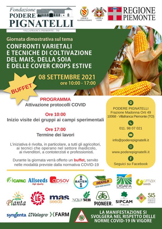 È prevista per mercoledì 8 settembre la giornata dimostrativa sul tema “Confronti Varietali e tecniche di coltivazione del mais, della soia e delle cover crops estive”, ospitata dalla Fondazione Podere Pignatelli presso la sede di Villafranca Piemonte, Frazione Madonna Orti 49.