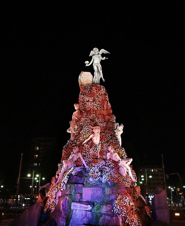 Un mantello di margherite sulla piramide di massi in cui sono intrappolati sette Titani, simbolo della forza e dell’asprezza della natura, che si protendono verso il Genio alato del progresso che, sulla sommità, in una mano regge un mazzo di fiori e con l’altra ne lancia uno, simbolo della riconciliazione tra scienza e ambiente nelle opere contemporanee. É l’omaggio artistico che avvolge il monumento al traforo del Fréjus di piazza Statuto a Torino nell’anniversario dei 150 anni del tunnel ferroviario più antico d’Europa, nella cornice delle iniziative dell’anno che la Commissione europea dedica alla promozione del trasporto ferroviario.