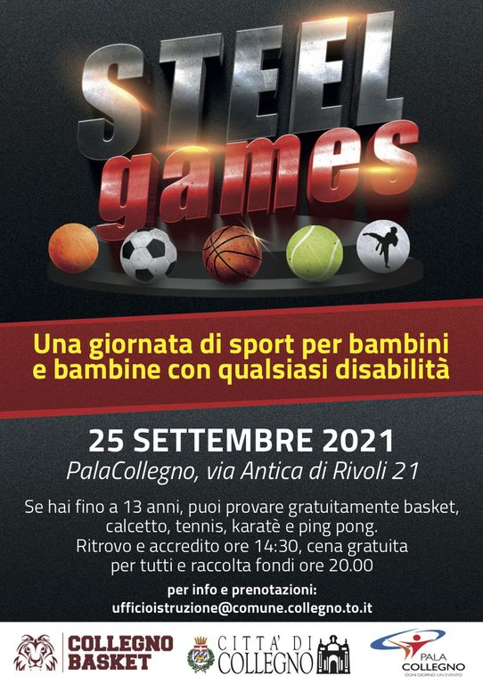 Come l’acciaio, “Steel” in inglese, che è più forte perché è frutto dell’unione di due elementi, così a Collegno negli "Steel games" l’unione di chi è disabile e chi no trova nello sport il punto di massima forza. Bambini e bambine fino ai 13 anni sabato 25 settembre potranno infatti provare gratuitamente al PalaCollegno basket, calcetto, tennis, ping pong e karate. Le iscrizioni possono avvenire direttamente all’Ufficio Istruzione scrivendo all'indirizzo ufficioistruzione@comune.collegno.to.it