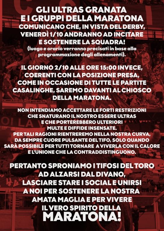 "Pertanto sproniamo i tifosi del Toro ad alzarsi dal divano, lasciare stare i social e unirsi a noi per sostenere la nostra amata maglia e per vivere il vero spirito della Maratona".