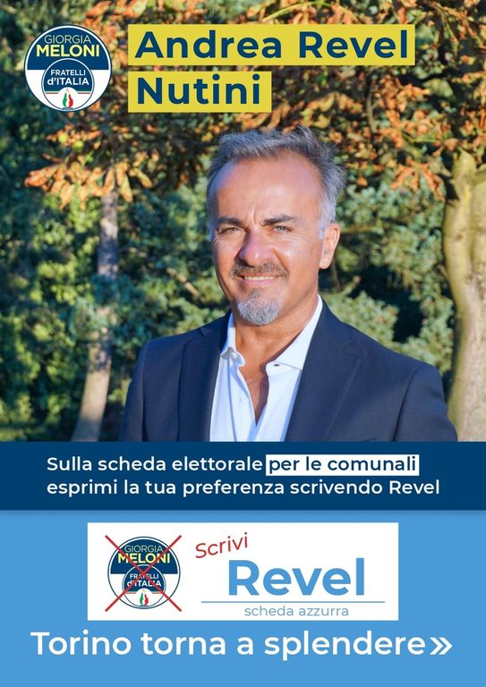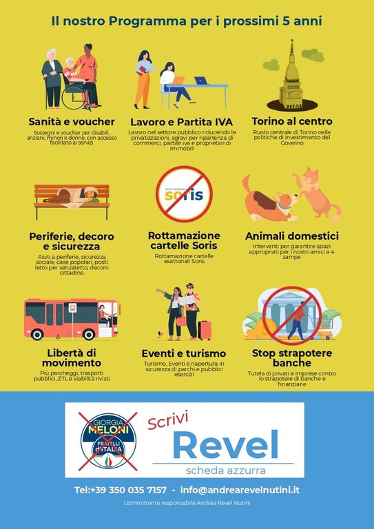 Al centro del programma per i prossimi cinque anni, anche le agevolazioni sui trasporti per le categorie più in difficoltà (specialmente i taxi, mediante l'utilizzo di voucher per disabili, anziani e donne in gravidanza) e l'assegnazione delle case popolari alle famiglie in attesa. "Torino torna a splendere", lo slogan lanciato da Revel Nutini invitando i cittadini alle urne.