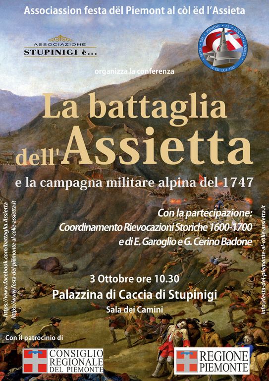 La Battaglia dell'Assietta, che venne vinta dall'esercito piemontese malgrado le notevoli differenze di forze in campo (32 battaglioni francesi, contro i 13 sabaudi) sarà al centro di una conferenza che, nella prestigiosa sede della Palazzina di Stupinigi, nella Sala dei Camini, si terrà nella mattina di domenica 3 ottobre, dalle ore 10.30, promossa dalla Associassion Festa dël Piemont al Còl ëd l’Assieta, con il patrocinio della Regione Piemonte e del Consiglio regionale.