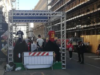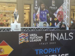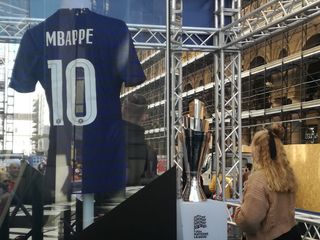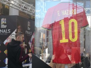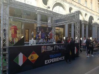 Le maglie di Hazard e Mbappé in bella vista, nella zona pedonale di via Roma. In mezzo a loro, il trofeo della Nations League in palio in questi giorni tra Torino e Milano.