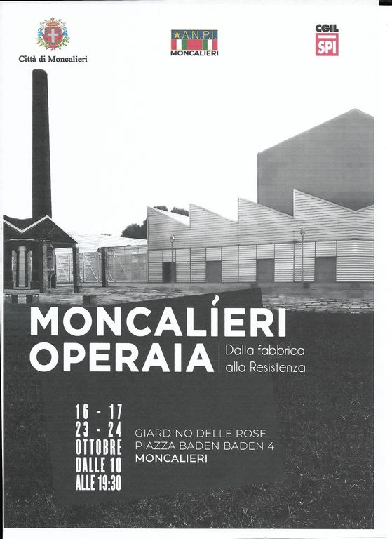 Per capire tali scelte è necessario osservare l’ambiente sociale in cui esse hanno potuto maturare. E’ quello che si propone di scandagliare la mostra che si inaugura sabato 16 ottobre, alle ore 14.30, al Giardino delle Rose di Moncalieri (ingresso libero, orario 10-19.30 domenica 17 e nel weekend del 23-24 ottobre), dal titolo suggestivo: Moncalieri operaia. Dalla fabbrica alla Resistenza. Promossa dall’Assessorato alla Cultura della Città di Moncalieri, è a cura della locale sezione Anpi e dello Spi-Cgil.