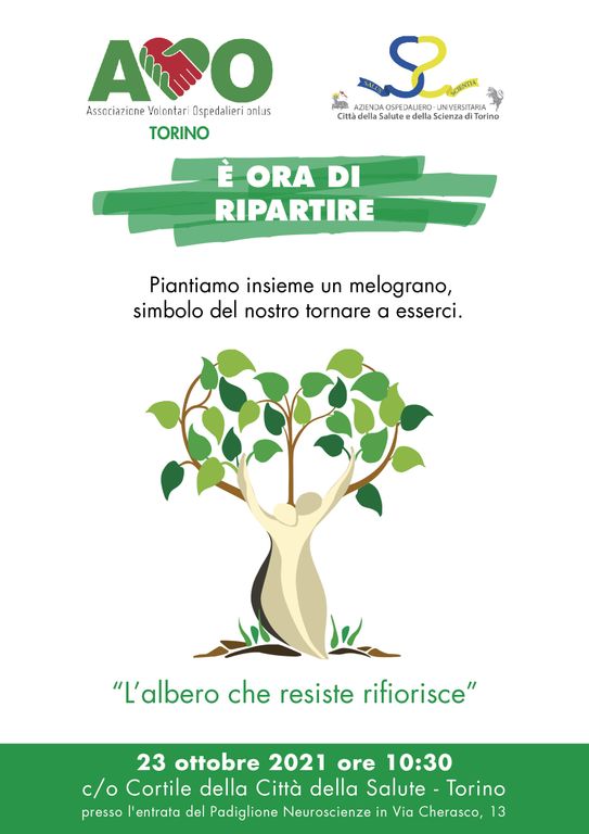 Sabato 23 ottobre alle ore 10.30 Avo Torino, in occasione della XIII Giornata Nazionale, e per festeggiare il proprio quarantesimo anno di attività, pianterà un albero di melograno nel cortile della “Città della Salute e della Scienza” presso l’entrata del Padiglione Neuroscienze in via Cherasco 13 a Torino.