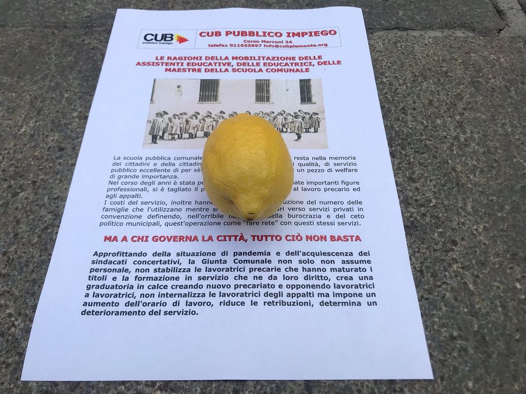 Con dei limoni posati davanti a Palazzo Civico, simbolo che evoca i lavoratori “spremuti” dal datore di lavoro, insegnanti, educatrici e assistenti educative del Cub Pubblico Impiego, di fronte alla sede del Comune di Torino, hanno riportato in auge un “vecchio” tema: quello del precariato.