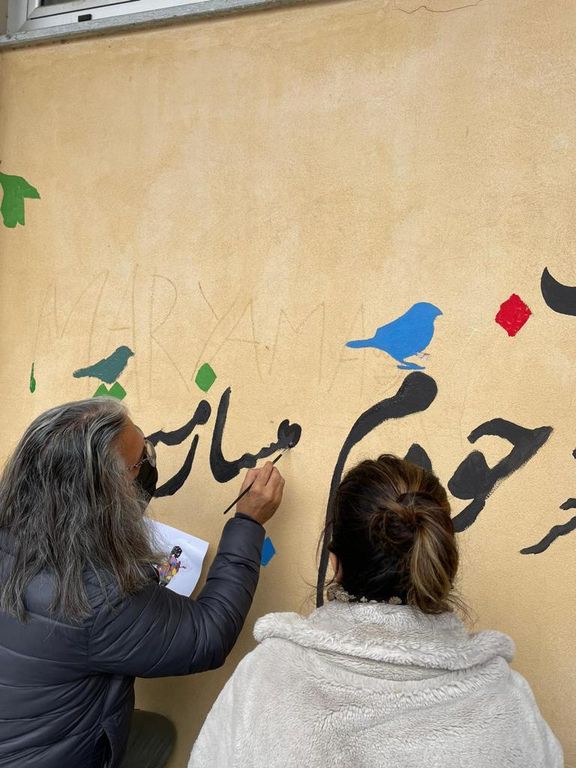 "E' un tributo alle giovani ragazze in Afghanistan a cui i talebani hanno impedito di andare a scuola - spiegano i tre artisti del collettivo, anche loro fuggiti dal regime talebano -. È raffigurata irremovibile e determinata con in mano una mappa dell'Afghanistan, piena di arte, cultura e colori. Il detto è una canzone molto famosa, di un famoso cantante della diaspora afghana. Si traduce letteralmente come: "Oh, mio amato paese! Finalmente ti costruirò da solo".