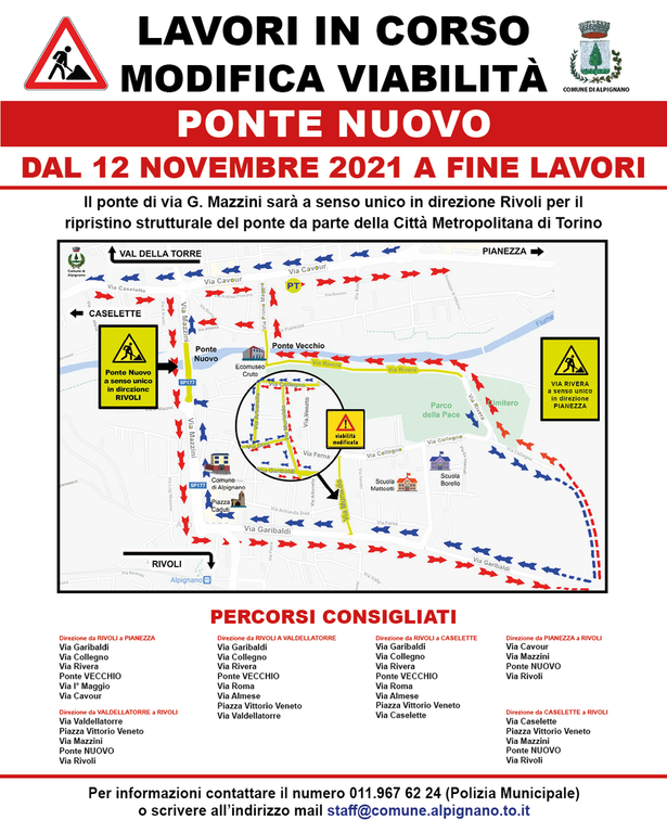 Sul Ponte nuovo si transiterà solo su una corsia in direzione Rivoli, limitata ai veicoli con massa non superiore alle 3,5 tonnellate e di larghezza non superiore a 230 cm., salvo mezzi di soccorso in attività di emergenza, mentre sul Ponte vecchio il senso unico sarà verso via Cavour.
