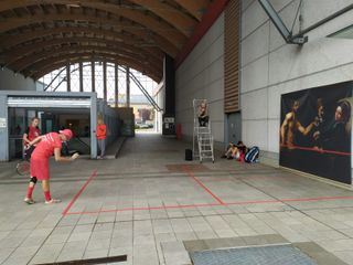 L'immagine che più di tutte sta circolando in questi giorni sui giornali e sui profili social torinesi e non solo è quella che vede gli 8 protagonisti delle Atp Finals passeggiare amichevolmente sotto i portici di via Roma. Un'altra immagine che circolerà – a suo modo - sarà quella di Alessandro Bulgini giocare a tennis contro la riproduzione di un quadro sul muro del Bricocenter di via Cigna: è questa la modalità scelta dall'artista 'di quartiere', che a Barriera di Milano ha stabilito la propria dimora abitativa e professionale, per analizzare e criticare la grande attenzione data al torneo internazionale di tennis in programma in questi giorni a Torino.