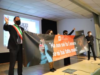 Al termine della mattina è stato esposto lo striscione celebrativo del 25 novembre sulla facciata del municipio di piazza 66 Martiri, ideato a partire dai lavori delle classi partecipanti al concorso.